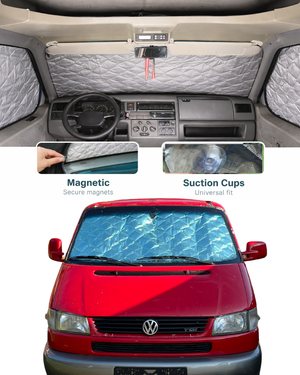Model-specific mosquito nets for VW T3/T25, T4, and T5 sliding door, rear hatch, and cab windows. No-see-um mesh, zip or magnetic entry, EU-made. DDP worldwide (no hidden fees).